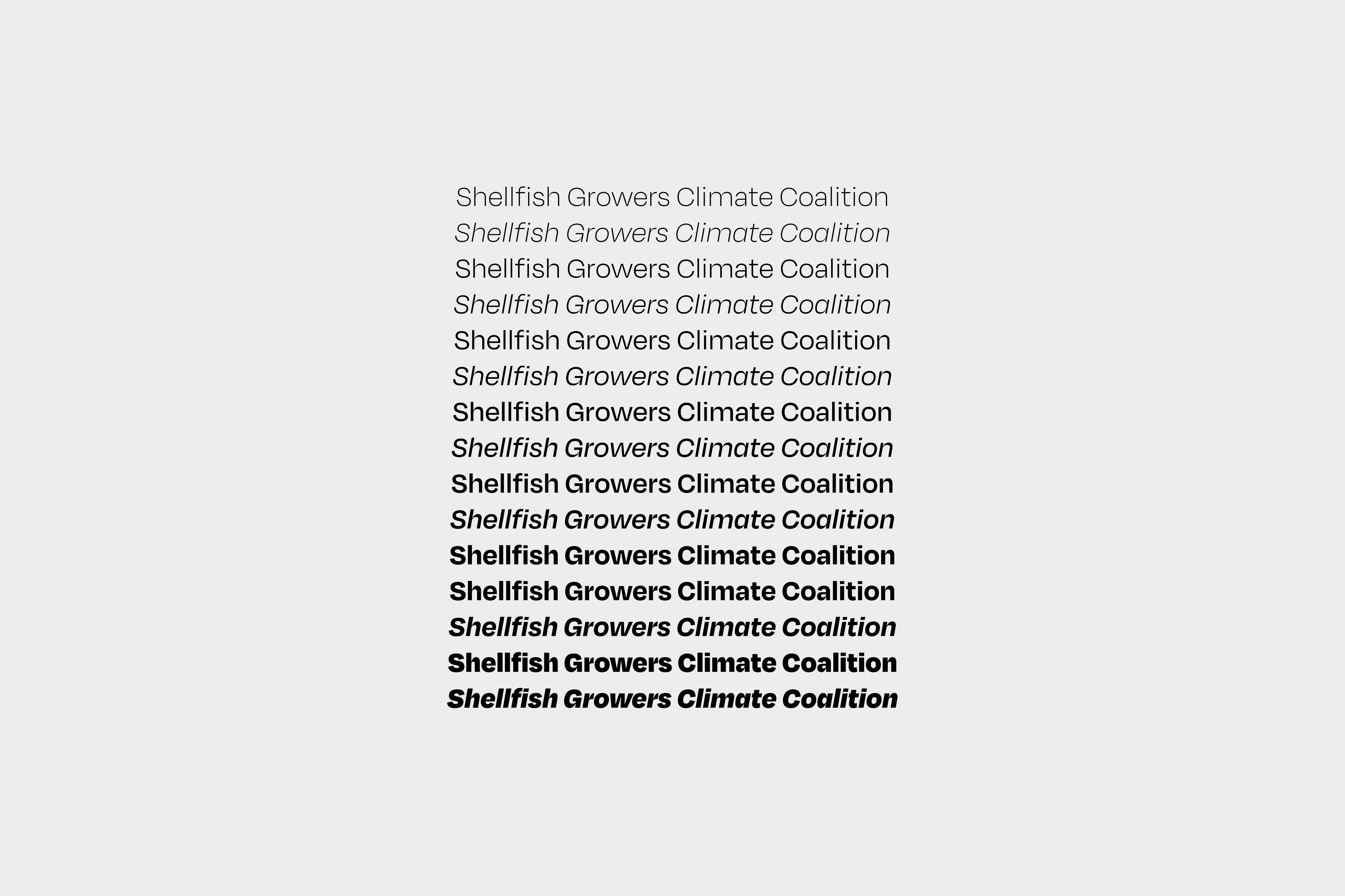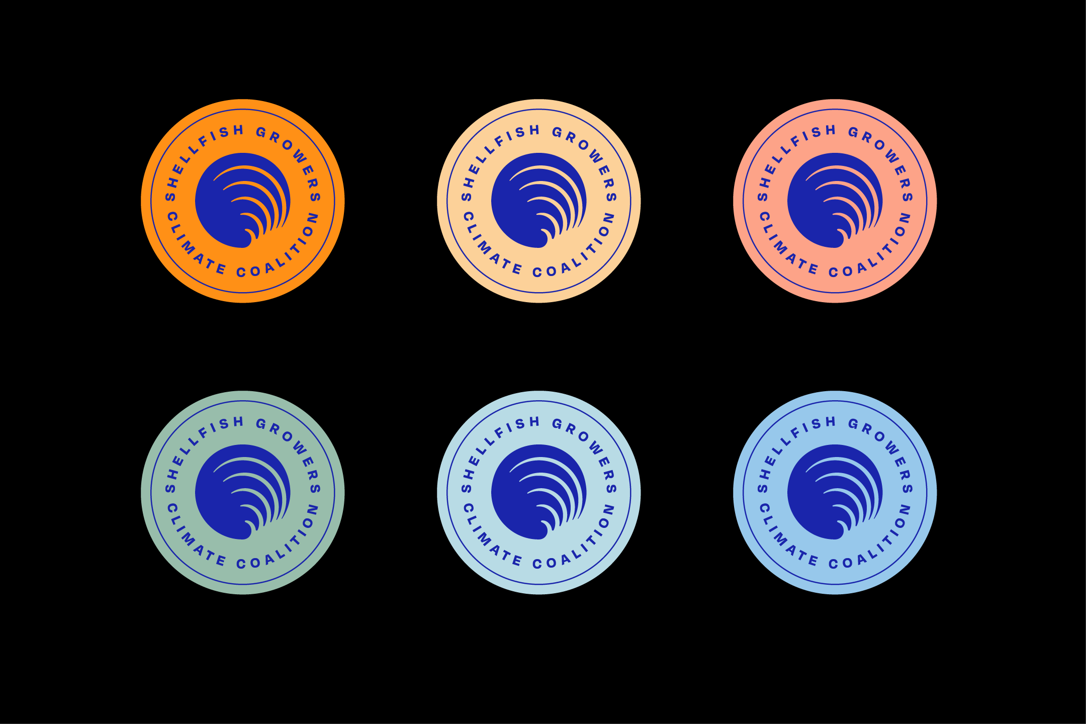 The design approach for the Shellfish Growers Climate Coalition (based on the use of concentric circles) is simultaneously informed by patterns seen on shellfish species and depictions of waves or ripples. This is evident in the logo design, which serves as a metaphor for the coalition’s mission of influencing climate policy through a collective effort. This is complemented with the choice of a Grotesque font and a coastal color palette.